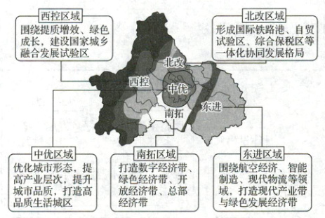 为促进城市空间结构进一步优化、城市环境更加宜居,成都市推动差异化空间功能布局,确立了“东进、南拓、西控、北改、中优”的城市空间发展战略。读图,完成 1、2 题。