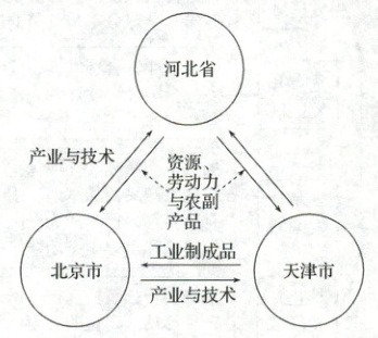 区域差异是区域关联的基础。北京市、天津市和河北省依据京津冀协同发展战略,强化各自的功能定位,共同推动要素流动,促进协同发展。下图为京津冀区域关联示意图,完成 5、6 题。