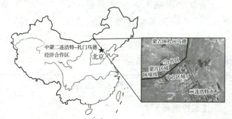 2024 年 3 月,国务院正式批复同意设立中蒙二连浩特一扎门乌德经济合作区。中方区域重点发展国际贸易、国际物流、进出口加工、跨境旅游及相关配套服务,蒙方区域重点发展大宗商品物流、进出口加工、国际商贸和文化旅游业。二连浩特与扎门乌德相距 4.5 千米,隔界相望,共同位于“一带一路”中蒙俄国际经济合作走廊关键节点上。作为各自国家的口岸城市,两地间外贸往来时间久远,是中欧班列“中通道”的重要战略枢纽。下图为中蒙二连浩特—扎门乌德经济合作区位置示意图。