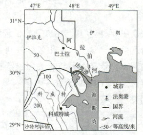 伊拉克地处西亚,首都为巴格达。法奥位于阿拉伯河河口处的南岸,是伊拉克历史上最大的油港,但因多次战争破坏严重。2022 年伊拉克政府申请重返“一带一路”成功,并把法奥港的建设交给中国公司,预计 2025 年完成。下图示意伊拉克法奥港位置。据此完成 1~3 题。