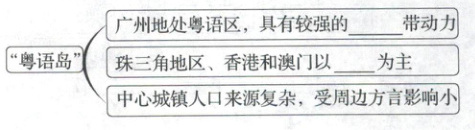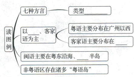 (1)语言类型复杂,空间差异大;以粤语、客家语为主,粤语主要分布在广州以西,客家语主要分布在东部;闽语主要分布在粤东沿海、雷州半岛;非粤语区存在诸多"粤语岛"。(4分)