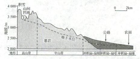 (2025·济南模拟)乌恰县位于新疆维吾尔自治区西部,帕米尔高原北部,塔里木盆地西端,天山南麓与昆仑山两大山系接合部。多年平均年降水量180mm,多年平均年蒸发量为1600mm。下图为乌恰县地形剖面示意图。据此完成4、5题。