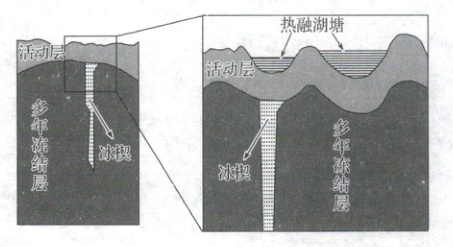 (2024·秦皇岛模拟)多年冻土分为上下两层,上层为夏季融化、冬季冻结的活动层,下层为多年冻结层。由于全球变暖,环北极圈多年冻土已开