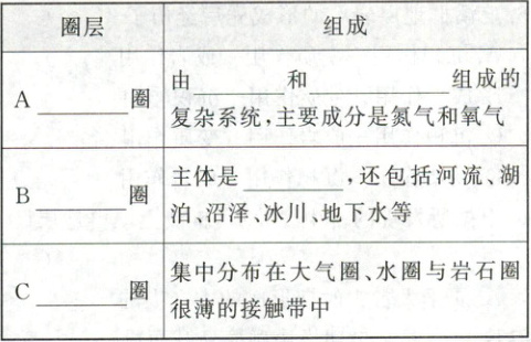3.C 4.B 5.B 第3题,具体思路分析如下:地壳属于岩石圈的一部分,A错误;岩石圈包括上地幔的顶部和全部的地壳,B错误;生物圈是地球表层生物及其生存环境的总称,位于大气圈的底部、水圈的全部、岩石圈的上部,与岩石圈关系密切,C正确;软流层的上部是岩石圈,D错误。第4题,大气圈是由气体和悬浮物质组成的复杂系统,A项错误;水圈由液态水、固态水、气态水组成,B项正确;生物圈是地球表层生物及其生存环境的总称,它包括大气圈的底部、水圈的全部和岩石圈的上部,C项错误;地球的外部圈层之间相互联系、相互制约,形成人类赖以生存的自然环境,与岩石圈的关系也较密切,D项错误。第5题,地下城建在大陆地壳上,大陆地壳平均厚度为39 - 41千米,地下城建在5千米深度左右,因此属于③圈层——地壳。