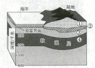 1.B 2.C 第1题,地震传播的方式是地震波,A项错误。纵波先到达岛上,所以岛上居民先感受到上下颠簸,横波后到达,岛上居民后感受到左右摇晃,D项错误,B项正确。震源深度12千米,其深度更深于上地幔顶部,结合图示信息可知,而软流层位于上地幔上部,可能位于软流层,C项错误。第2题,①②均位于莫霍界面以上,其中①在海洋缺失,所以①+②为地壳,①为上地壳的硅铝层,②为下地壳的硅镁层,地幔位于地壳以下,A、B项错误。③属于软流层以上的部分,属于岩石圈的一部分,C项正确。④为软流层,位于上地幔上部,不属于下地幔,D项错误。
