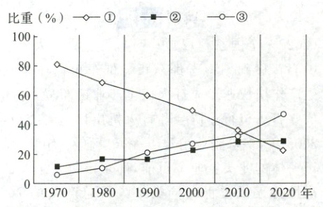 (2024·成都模拟)近50年来,随着社会经济发展,我国三大产业结构发生明显变化,各产业就业人口也随之发生变化。下图为1970—2020年我国三大产业就业人口比重变化情况。完成4~6题。