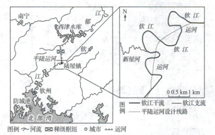 (2024·苏州模拟) 2022 年 8 月 28 日,西部陆海新通道——平陆运河开工建设,工程北起郁江(西江的支流)的西津水库,在陆屋镇汇入钦江河段,沿干流进入北部湾。通过建设航运梯级枢纽和运河航道工程,构建连接西江内河航道网和北部湾港的江海联运体系。左图是平陆运河线路示意图,右图为钦江现状及运河裁弯取直段的平面变化图,完成 1~3 题。