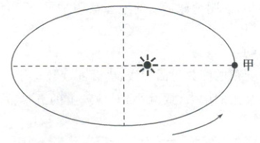 (2024·河南联考)地球公转轨道的特殊性,导致地球在绕日公转运动中,地球公转的角速度和线速度一直处于变化状态。因此,地球上不同日期的太阳日长度随地球公转速度变化也存在着一定程度的变化。下图为地球绕日公转轨道示意图,甲为公转轨道上一点。据此完成1、2题。