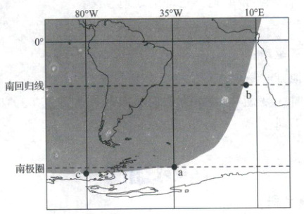 1.A 2.D 第1题,据图可知,南极圈及以内大部分地区为极昼,故图示日期最接近北半球的冬至日。第2题,结合图中时刻,具体思路分析如下:a地位于南半球且南极圈内出现极昼现象,可知a地即将日出东南,A错误;c地出现极昼现象而b地未出现,B错误;据晨线与赤道交点为6时,可算出c地的地方时为0时,C错误;图示时刻,a、b、c三地均位于晨线上,则三地的太阳高度相同,D正确。
