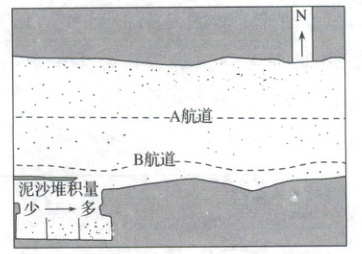 内河航运船舶航道的区位选择要根据水流的速度、泥沙沉积的实际情况而定,应尽可能实现节省能源、降低运费成本等效益最大化。下图为某河流航道图。完成3、4题。