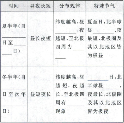 $\begin{cases} 昼弧长于夜弧:\underline{\quad\quad\quad\quad} \\ 昼弧短于夜弧:\underline{\quad\quad\quad\quad} \\ 昼弧等于夜弧:\underline{\quad\quad\quad\quad} \end{cases}\underline{\quad\quad\quad\quad} $