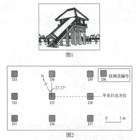 (2024·广东选择考)距今约 3000 年前的金沙遗址$(30^{\circ}41'N,104^{\circ}01'E)$是古蜀国时期的一处大型聚落遗址。在该遗址祭祀区的东部有一处九柱建筑基址,其 9 个柱洞呈“田”字形分布。研究发现,这些柱洞分布具有一定的天文属性。图 1 为九柱建筑的复原示意图;图 2 示意该建筑柱洞平面分布及当时冬至日的日出方位。据此完成(1)(2)题。