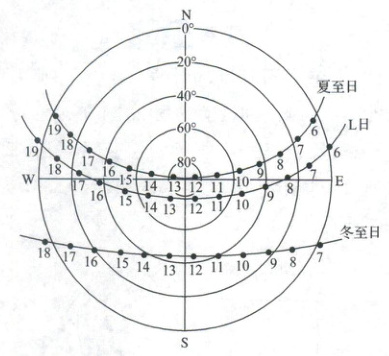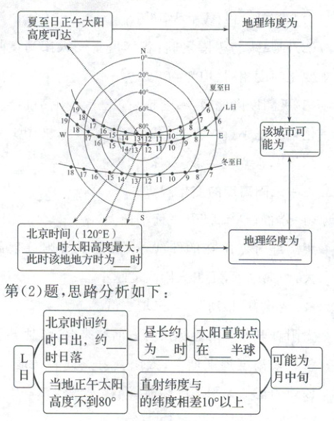 (2023·天津等级考)下图是我国某城市冬至日、夏至日及L日不同时刻的太阳高度及方位示意图。读图完成(1)(2)题。