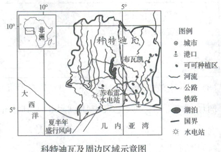 位于北纬10°附近,地处北半球、低纬度;(2分)南部濒临几内亚湾;(2分)位于非洲西部。(2分)