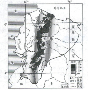 (大部分地区位于1°N~5°S)地处热带;(2分)位于南美洲西北部,西临太平洋;(2分)北部与哥伦比亚接壤,东、南部与秘鲁相邻。(2分)