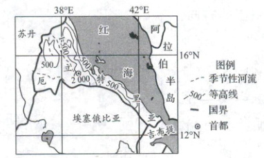 地处低纬度(热带);(2分)位于东非及非洲之角最北部(非洲东北部),西(北)邻苏丹,南邻埃塞俄比亚、吉布提,北与沙特阿拉伯相望;(2分)东濒红海,临近连接欧、亚、非海上通道的咽喉——曼德海峡。(2分)