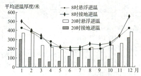 (2024·山东省实验中学模拟)逆温是指对流层大气中气温随高度增加而上升的现象,从地面开始的逆温称为接地逆温,从离地面一定高度处开始的逆温称为悬浮逆温。逆温厚度是指出现逆温现象上、下限的高度差。下图反映甘肃省酒泉市2009—2018年8时和20时平均逆温厚度的年内变化。据此完成1~3题。