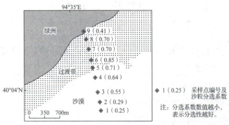 (2024·湖北选择考)某科研小组利用多套测风系统,观测记录了敦煌绿洲边缘某年沙漠风和绿洲风的风速、风向与频次,并对表层沙粒采样分析。结果发现,当地冬季白天以沙漠风为主,晚上沙漠风和绿洲风频次相当;自沙漠向绿洲方向风速呈减小趋势,绿洲风速衰减幅度比沙漠风小。如图示意采样点及其沙粒分选系数值。据此完成(1)(2)题。