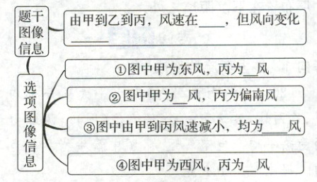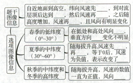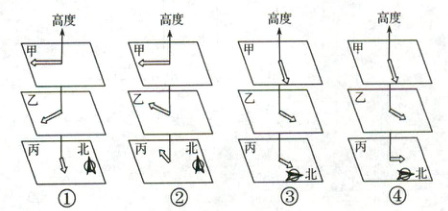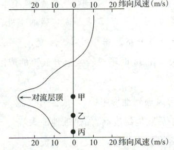 (2022·浙江6月选考)下图为北半球某地某季节平均纬向风速随高度分布图,甲、乙、丙为该地三个不同高程面,完成(1)(2)题。