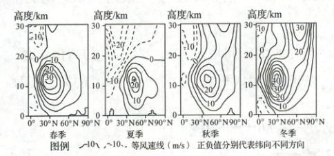 (1) 能正确反映上图平均纬向风速随高度分布的地点位于(