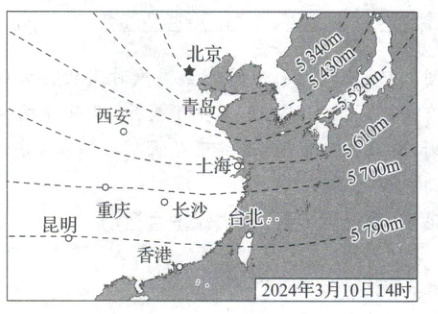 (2024·临沂模拟)下图为东亚部分地区500百帕等压面的高度分布图,此时近地面气压形势与5000多米高空相反。读图完成1、2题。