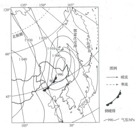 倒暖锋是我国东北地区冬季特有的一种由北向南的逆行暖锋天气过程。它往往发生在寒潮过境 2 天之后,受来自鄂霍次克海气团的影响极大。下图为某年 1 月 23 日某次倒暖锋过境时近地面气压形势图。
