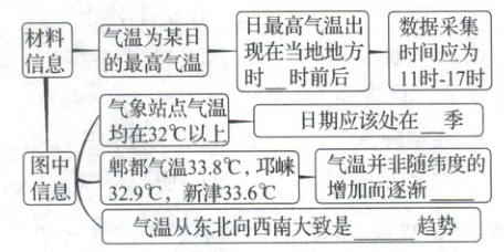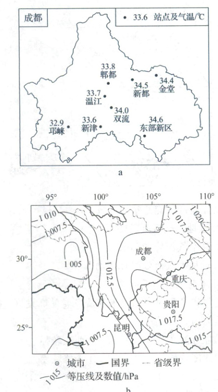 (2024·北京等级考)2024 年成都世界园艺博览会于 4 月 26 日至 10 月 28 日举行。图 a 显示成都部分气象站点 2023 年 4 月—10 月某日的最高气温,图 b 为北京时间 2024 年 5 月 15 日 14 时西南地区局部海平面气压分布图。读图,完成(1)(2)题。