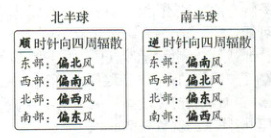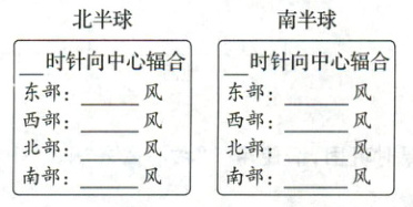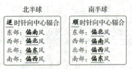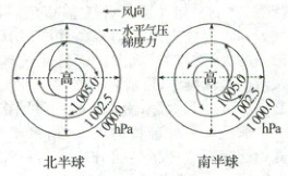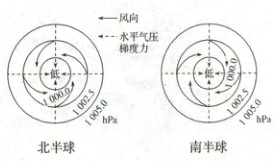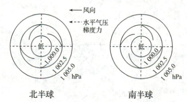 (1)在下图中绘制南、北半球气旋的水平气压梯度力和风向。