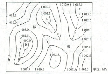 A低压区 B高压区 C高气压 D低气压 E高压脊 F低压槽 G高压脊 H低压槽