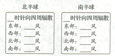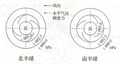 (1)在下图中绘制南、北半球反气旋的水平气压梯度力和风向。