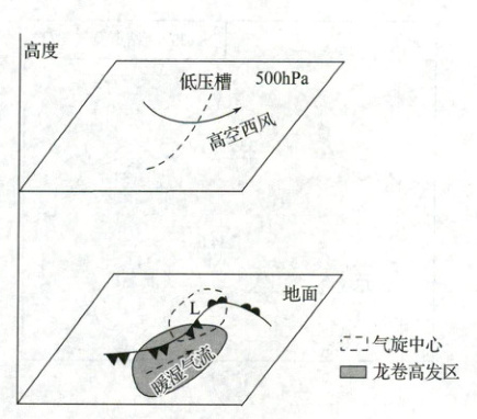 1.A 2.B 第1题,图示发育温带气旋龙卷的区域近地面为气旋,呈逆时针辐合,A正确,C错误;高空为单一的强西风,并非旋转气流,B错误;高空摩擦力小,风速大,D错误。第2题,具体思路分析如下:辽宁省临近海洋,水汽条件较好 ①正确 温带气旋龙卷是伴随温带气旋发育的剧烈上升涡旋,高空较强的西风 ②错误 对其形成影响小 在东北地区中,辽宁省纬度较低,受暖气流影响较大,更易受热上升 ③正确 冷涡会形成弱副暖湿气流,不利于龙卷的发展 ④错误