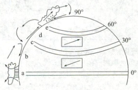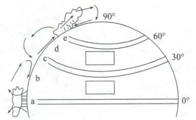 (1)a赤道低压带、b东北信风带、c副热带高压带、d西风带、e副极地低压带。