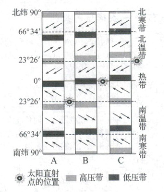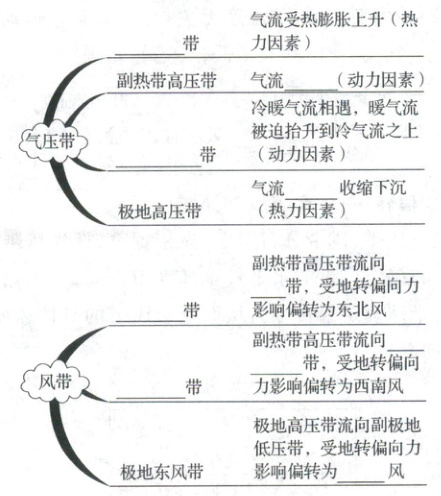的南北移动。③气压带和风带季节移动的规律:就北半球而言,大致夏季