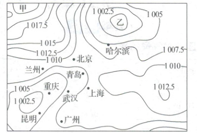 (2024·枣庄模拟)下图是某区域海平面等压线图,图中箭头表示甲地风向,甲、乙两地摩擦力大小不同,乙地风力大于甲地。完成 4、5 题。