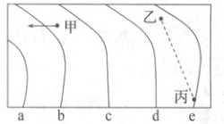 4. C 5. D 第4题,风由高压区吹向低压区。由甲地风向可知,气压值由e到a逐渐减小。乙、丙处等压线向数值较大的方向弯曲(凸高为低),可知从乙到丙气压变化表现为先下降后上升。第5题,甲地风向沿水平气压梯度力方向(垂直等压线,由高压指向低压)向右偏转,与等压线斜交,可知该区域位于北半球近地面。由材料可知,甲、乙两地摩擦力大小不同,乙地风力大于甲地,可知乙地摩擦力小,风向向右偏转角度比甲地更大,作图可以得出乙地风向是东南风。
