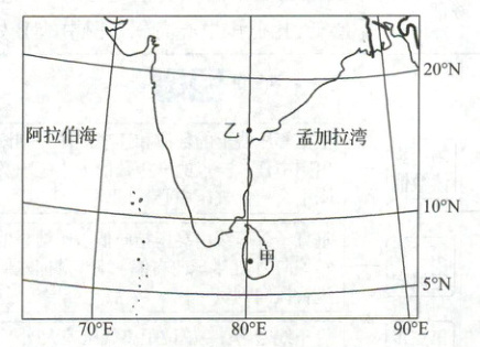 该地(甲、乙两地)地处南亚区域,夏半年西南季风由印度洋挟带海洋水汽至陆地,甲地地处西南季风迎风坡,受地形抬升,降水丰沛(乙地地处德干高原东侧,西南季风背风坡,气流下沉,降水较少);冬半年东北季风挟带海洋水汽能力有限,甲、乙两地降水量差异不大,故年降水量甲地更大。