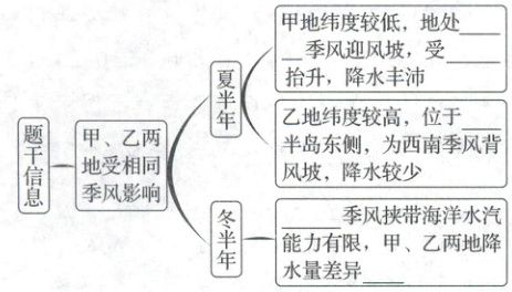 (2)甲乙两地受相同季风影响,但相比乙地,甲地年降水量更大,分析季风为甲地带来更多降水的原因。(6分)