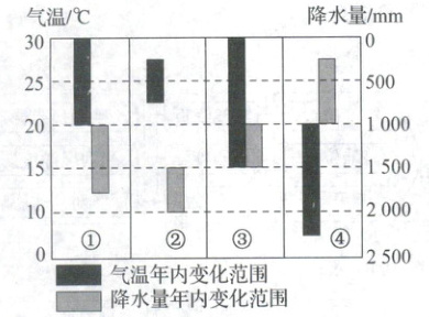 ( 2024·信阳模拟)读几种气候的气温和降水量年内变化范围图,完成1、2题。