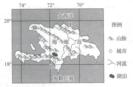 ( 2024·无锡模拟)海地岛是加勒比海中第二大岛。该岛年平均气温为22~30°C,岛屿年降水量区域差异大,最少的地区550mm左右,最多的地区可达2 000mm。下图为海地岛位置示意图。完成3、4题。