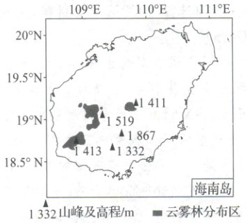 热带云雾林一般分布在热带山地的山顶或山脊,有持续性或季节性云雾覆盖,植株相对矮小、树干弯曲。海南岛热带云雾林分布在海拔1 200米以上,下图为该岛云雾林主要分布区示意图。据此完成5、6题。
