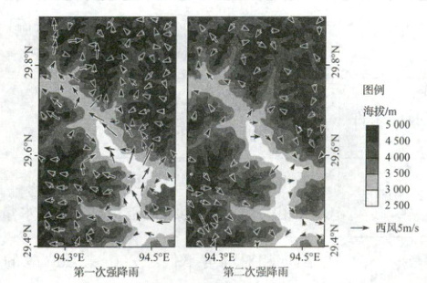 【典例 2】(2024·湖南选择考)2019 年 9 月 17-18 日西藏林芝地区出现了两次强降雨。研究表明,深入谷地的季风为该地降雨提供了充足的水汽,山谷风影响了降雨的时空变化,使降雨呈现明显的时段特征。下图示意两次强降雨时距地面 10 米处的风向与风速。据此完成(1)(2)题。