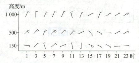 (2022·全国乙卷)我国一海滨城市背靠丘陵,某日海陆风明显。下图示意当日该市不同高度的风随时间的变化。据此完成(1)~(3)题。