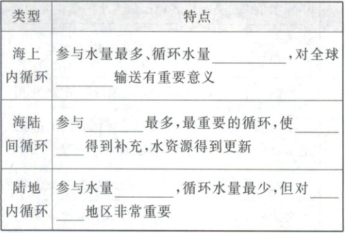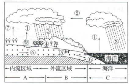 (1)水循环类型:____(A),____(B,最重要的水循环),____(C,循环水量最大)。