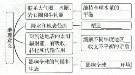 - 对到达地表的太阳辐射能,有吸收、转化和传输作用:缓解不同纬度地区____收支不平衡的矛盾