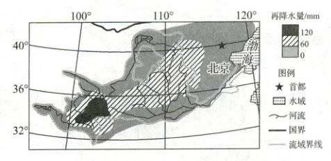 (2024·重庆模拟)陆地流域蒸腾和蒸发的水汽在流域内及周边形成的降水称为再降水。某学者对黄河中上游地区蒸腾和蒸发的水汽进行追踪,下图为这些水汽形成的再降水量分布图。完成 1、2 题。
