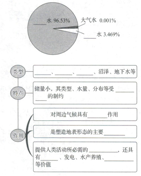 1.海洋 陆地 河流 湖泊 冰川 自然环境 调节 动力 淡水资源 航运 生态服务