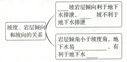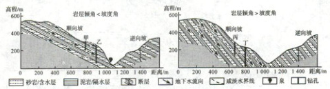 )A. 顺向坡,岩层倾角小于坡度角,有地下水出露地表
