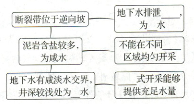 (2024·湖北选择考)四川盆地西南缘严重缺水区地下水多咸水。该区砂岩与泥岩(含盐多)交替分布,具有“丘坡补给、谷地排泄”的特点。研究发现,地下水排泄条件好,盐分不易积累,发育淡水;反之则发育咸水。如图示意不同丘坡地下水排泄条件。据此完成(1)~(3)题。