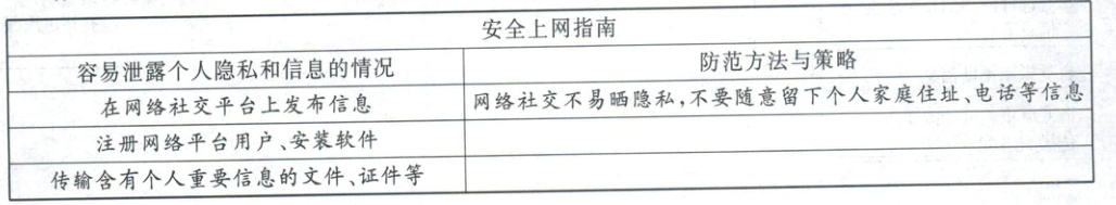 (4)①注册网络平台用户、安装软件——在下载手机应用程序时,要选择正规的应用商店,避免下载来源不明的应用程序;在安装应用程序时,要仔细查看权限要求,只给予必要的权限;对于一些过度索取权限的应用程序,要保持警惕,可以选择不安装或卸载。传输含有个人重要信息的文件、证件等——给别人发电子版证件,尤其是身份证,要明确对方身份和用途;对证件信息进行适当处理,注明用途和时间;用加密邮件或安全的方式传输协议,确保传输过程的安全性;提醒对方注意保护证件信息的保密性,不要随意将证件信息泄露给第三方等。