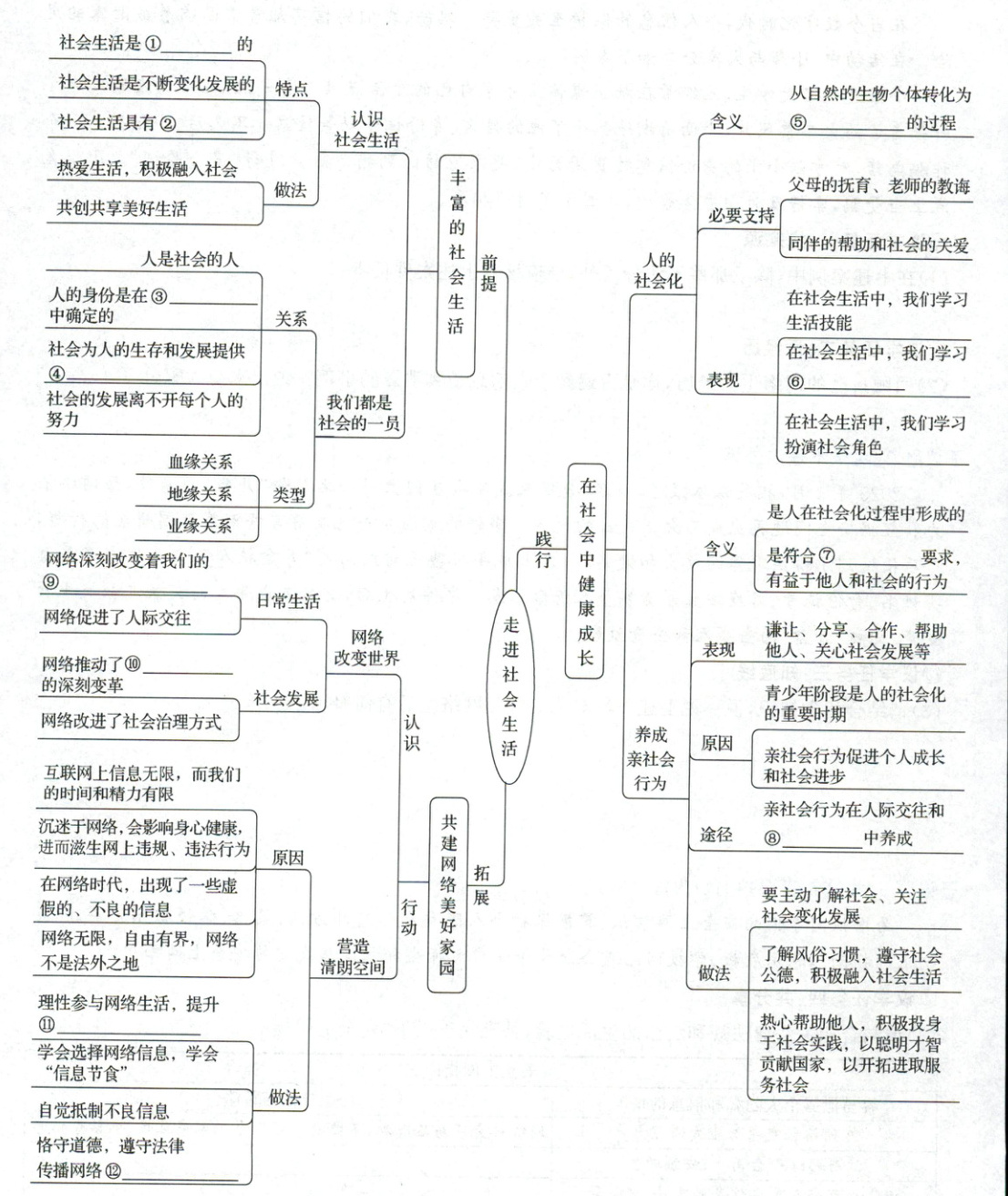 ①丰富多彩 ②公共性 ③社会关系 ④必要条件 ⑤社会人 ⑥行为规范 ⑦社会道德 ⑧社会实践 ⑨生活方式 ⑩生产方式 ⑪媒介素养 ⑫正能量